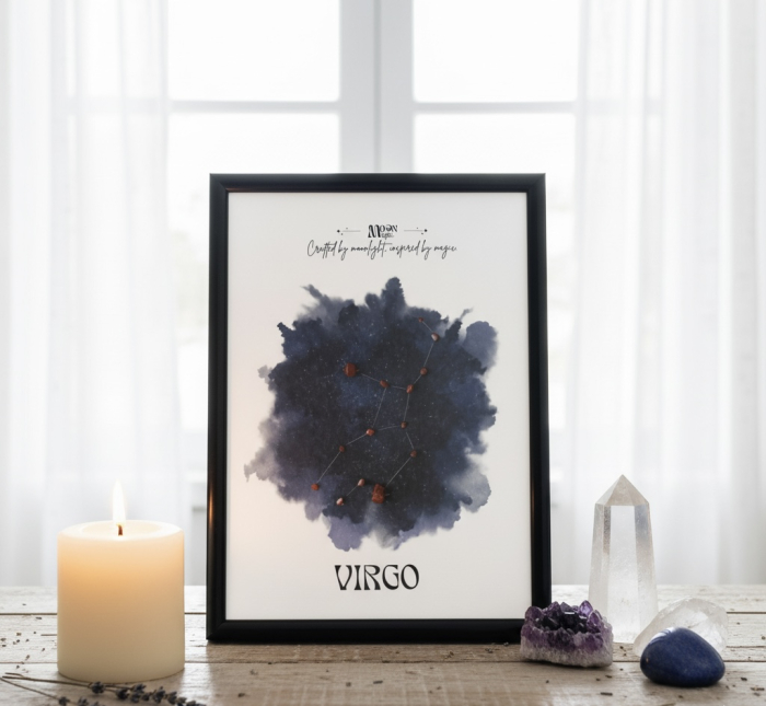 Tabloul Virgo reda constelatia Fecioarei intr-o compozitie eleganta si echilibrata, realizata cu detalii din jasp rosu natural. Energia acestuia reflecta esenta zodiei Fecioara, claritate, rabdare si forta de a contrui cu sens si devotament.